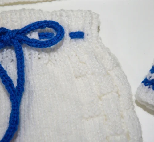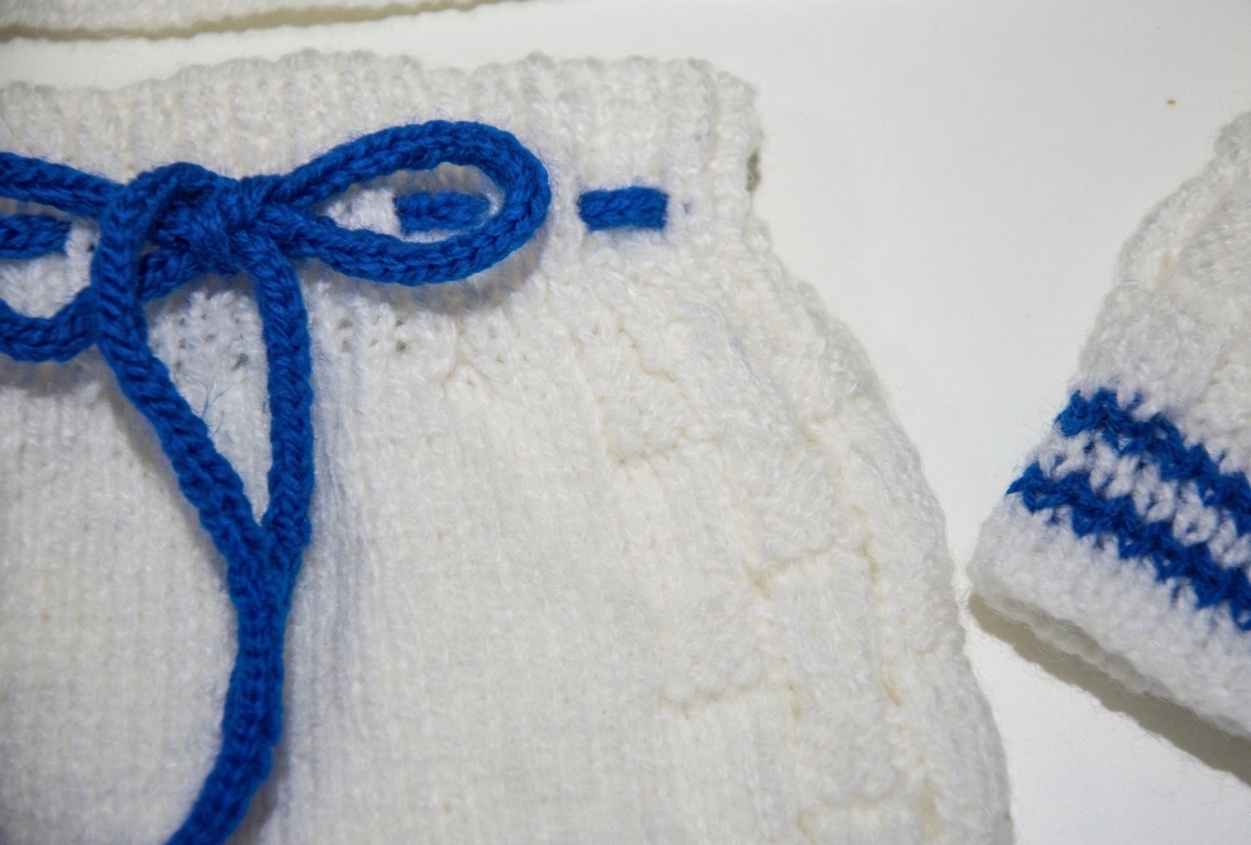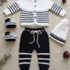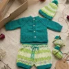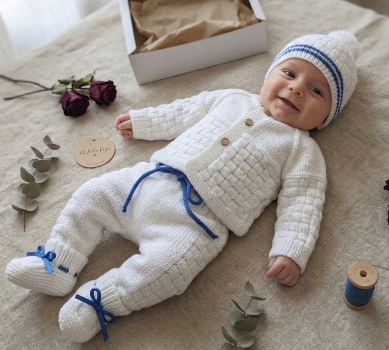 El conjunto es súper completo y versátil para mantener al bebé abrigado y cómodo en todo momento. Incluye un suéter abotonado, un pantaloncito con cordón ajustable en la cintura, un infaltable gorrito con pompón y un par de escarpines haciendo juego.
