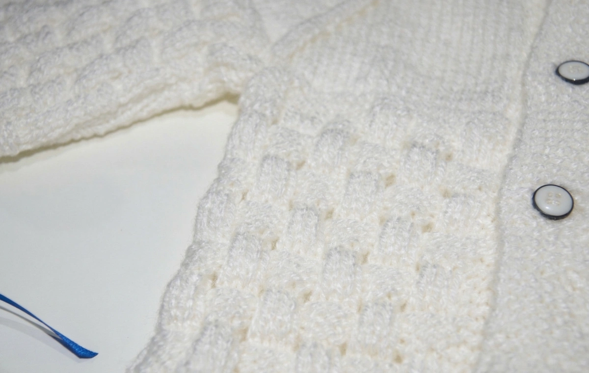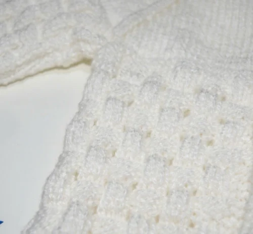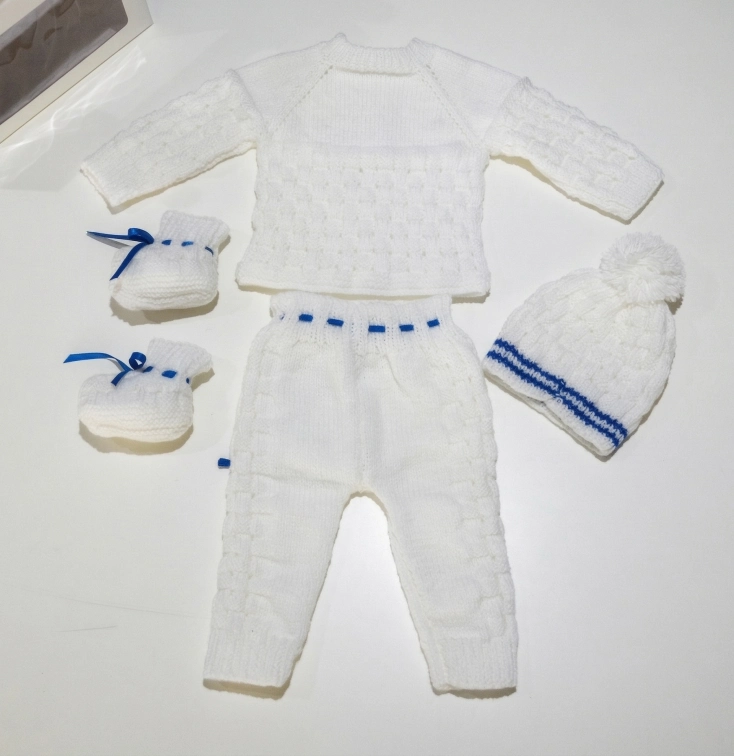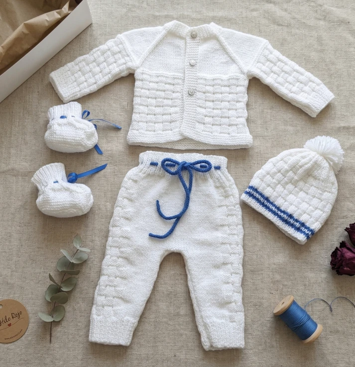 Elegancia, pureza y máxima ternura para los primeros meses de tu bebé. Este deslumbrante ajuar de 4 piezas está tejido íntegramente a mano con un bellísimo «punto fantasía» en relieve. Su base en color blanco inmaculado resalta a la perfección con los delicados detalles, lazos y bordes en color azul, logrando un diseño clásico y sofisticado. 🧶🤍💙