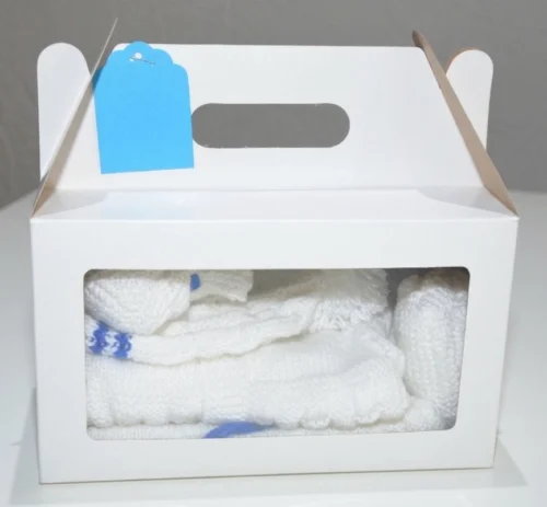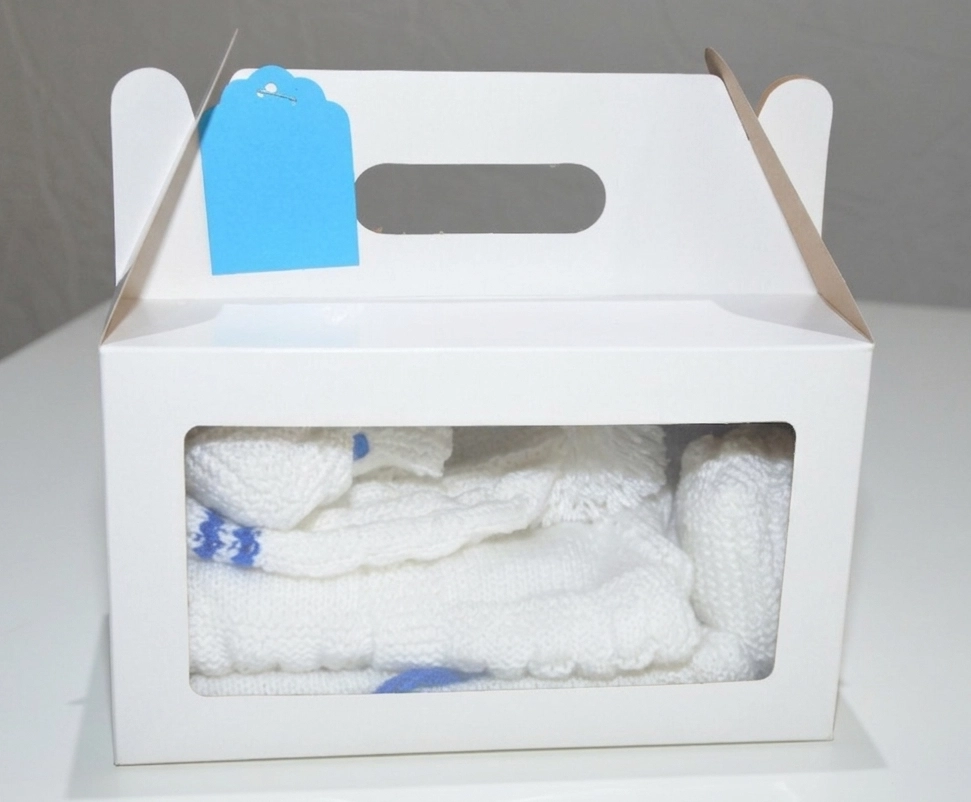 Confeccionado con la dedicación que solo lo artesanal puede ofrecer, este ajuar se entrega en una hermosa caja tipo valijita con visor. Además, incluye una tarjeta azul en blanco, ideal para que le sumes una dedicatoria personal. ¡Un regalo de nacimiento verdaderamente inolvidable! 🧸🎁