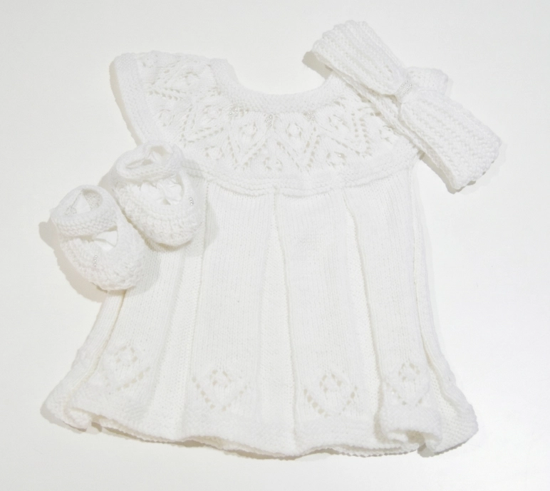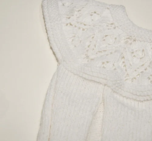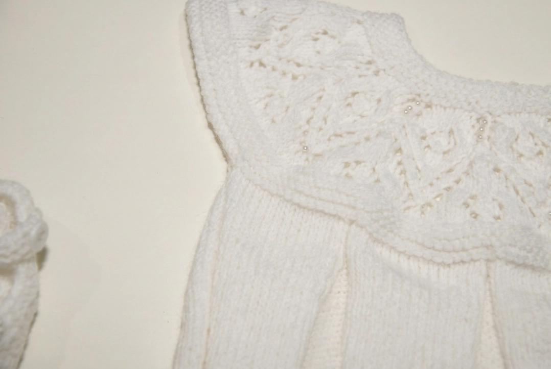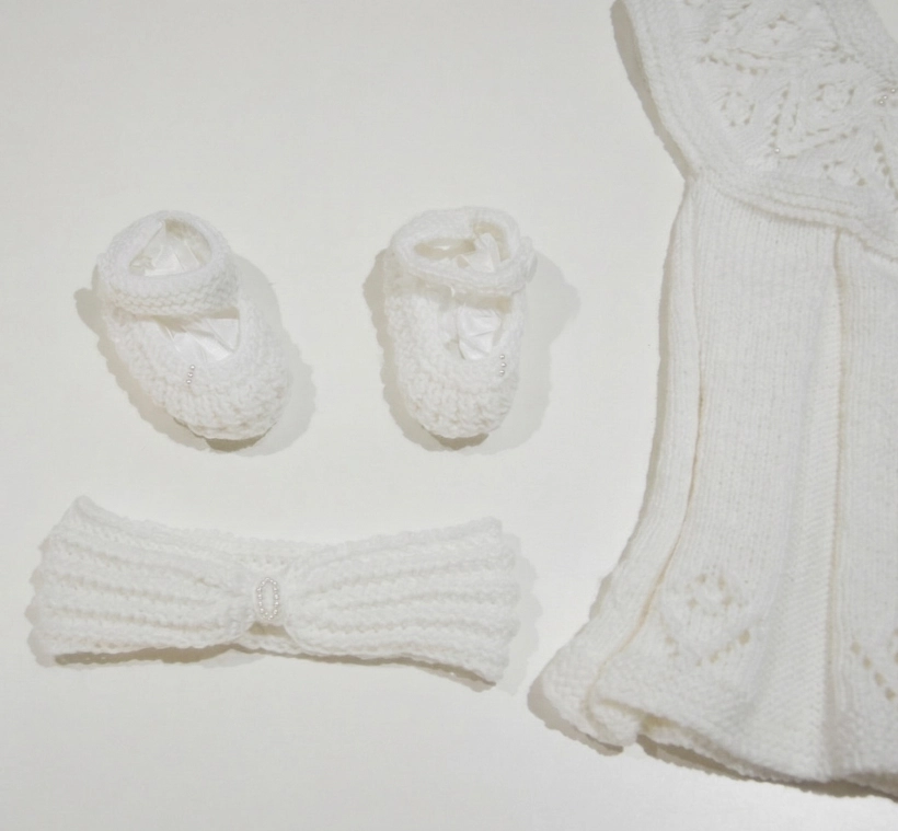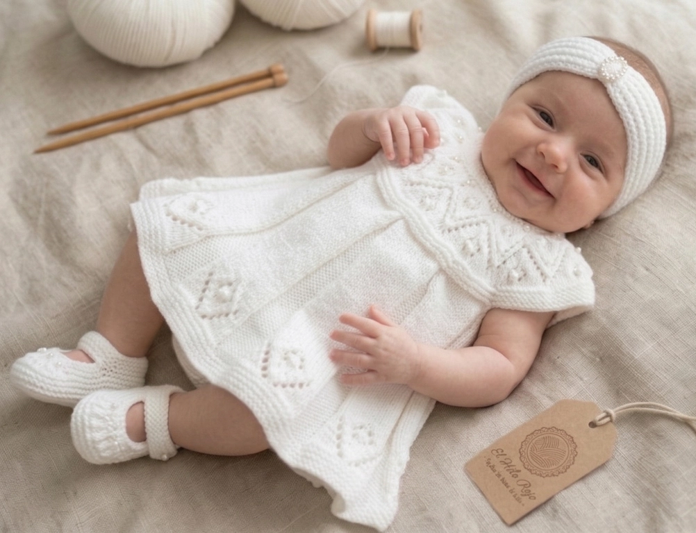 La máxima expresión de dulzura y elegancia para vestir a tu bebé. Este deslumbrante conjunto de 3 piezas está tejido íntegramente a mano en un blanco puro y luminoso. Su diseño destaca por un bellísimo canesú trabajado con sutiles detalles perlados y una falda con un delicado punto fantasía que le aporta movimiento y textura. 🤍🎀