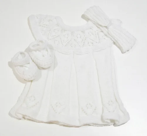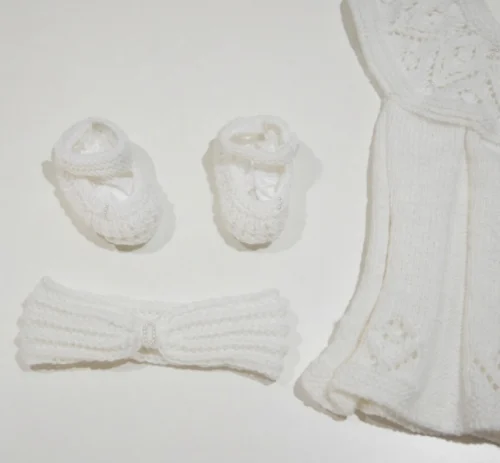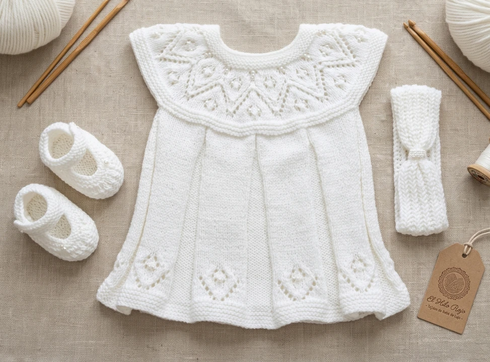 El ajuar incluye el vestido principal, una tierna vincha haciendo juego con detalle central, y un par de zapatitos suaves para completar un look de ensueño. Es una opción perfecta para bautismos, primer mes, o para que tu bebé luzca radiante y cómoda en cualquier ocasión especial. ✨